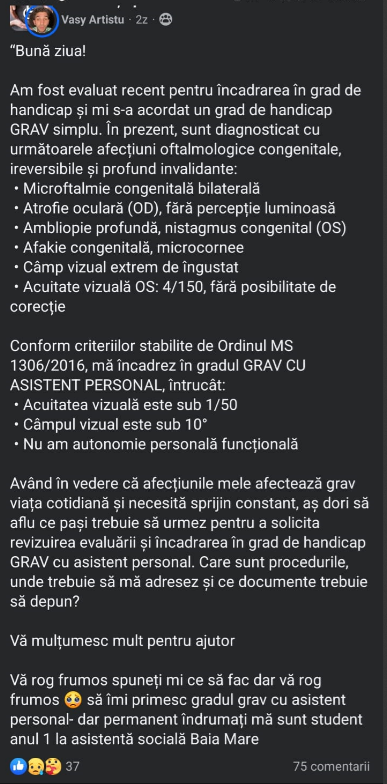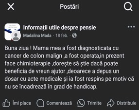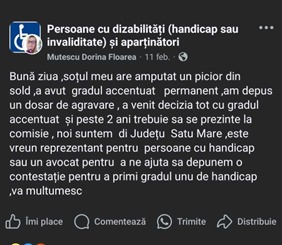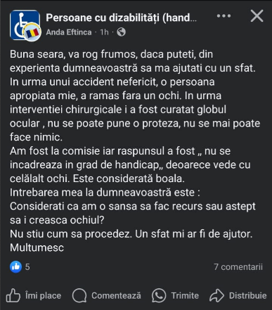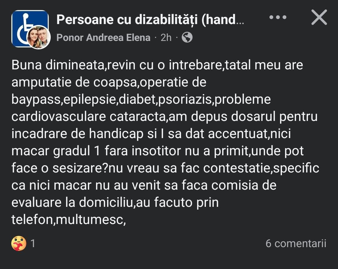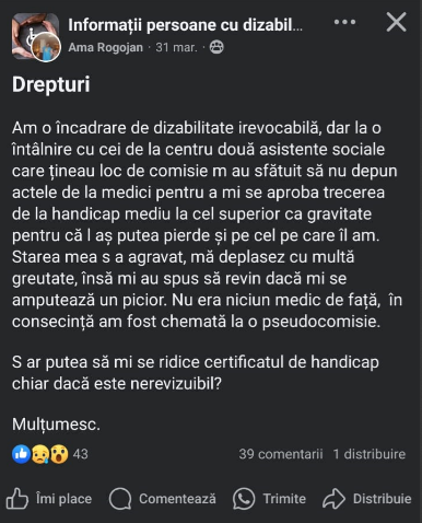 Lately, more and more people with serious conditions are reporting, on online groups, that the degree of disability established by the authorities does not reflect the medical and social reality they live in. In some cases, people unable to work, move around, or care for themselves have received light placements, without the right to a companion or additional benefits.