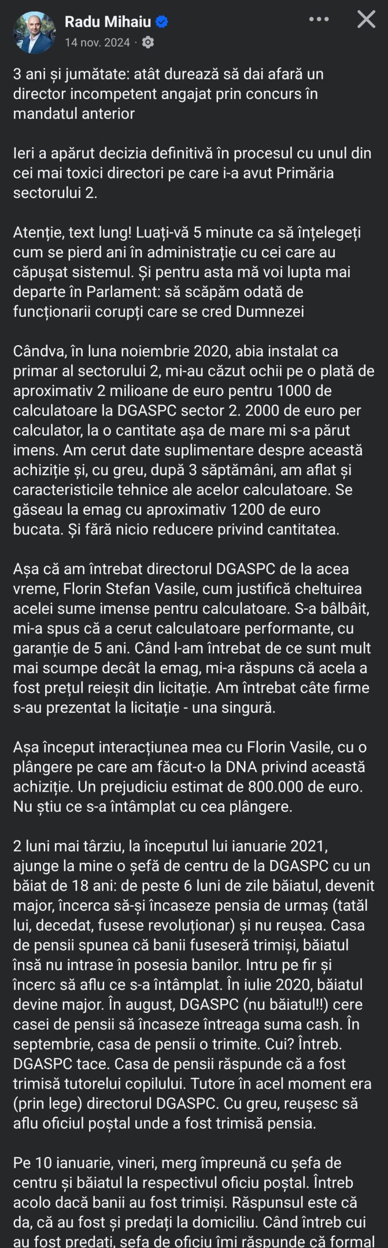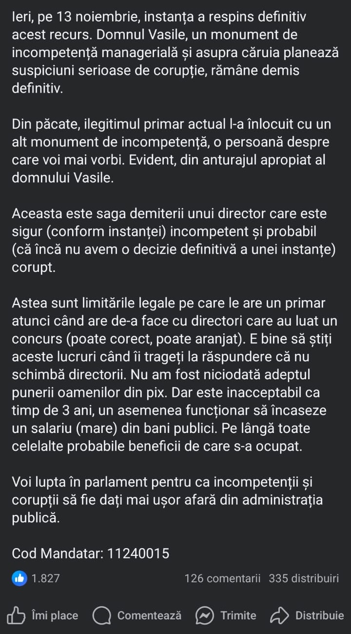 The post from the Facebook page of Radu Mihaiu, former mayor of sector 2: