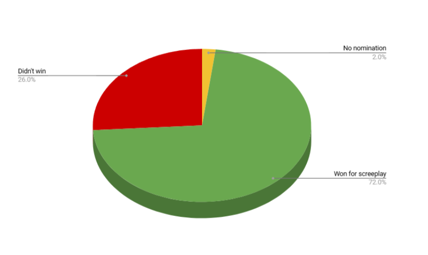Het is een bekend feit dat een film slechts zo goed is als het scenario. Het winnen van de Oscar voor Beste Originele Scenario of Beste Bewerkte Scenario blijft een van de beste indicatoren voor een Oscar voor Beste Film. Ik heb de Oscarwinnaars van de afgelopen 50 jaar geanalyseerd en hun prestaties in de categorieën voor Beste Scenario. De resultaten, weergegeven in het cirkeldiagram, ondersteunen deze bewering: 72% van de Oscarwinnaars won ook de Oscar voor Beste Scenario, terwijl slechts 26% dat niet deed. De enige Oscarwinnaar van de afgelopen 50 jaar die zelfs geen nominatie voor Beste Scenario ontving, is Titanic .