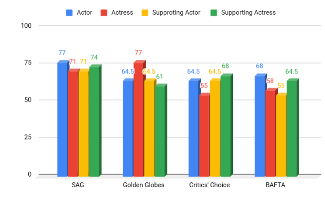 De SAG Ensemble Award voor Beste Acteur/Casemble in een Film is een van de sterkste voorspellers voor de Oscar voor Beste Film. Sinds de introductie van deze categorie in 1995 heeft bijna elke winnaar van de Oscar voor Beste Film een ​​nominatie voor de SAG Ensemble Award ontvangen. Slechts twee films, Green Book (2018) en Nomadland (2020), hebben de Oscar voor Beste Film gewonnen zonder deze erkenning. De correlatie tussen deze twee categorieën van verschillende prijsuitreikingen komt neer op de samenstelling van de stemmers. De leden van de Academy Awards zijn verdeeld in 19 takken die verschillende categorieën vertegenwoordigen, waarbij de acteurstak de grootste is met 12,7% van alle stemmers, van wie de meerderheid ook SAG-leden zijn. Omdat de Oscar voor Beste Film de enige prijs is waarover de gehele Academy stemt, vergroten sterke acteerprestaties de kans van een film op de Oscar voor Beste Film.
