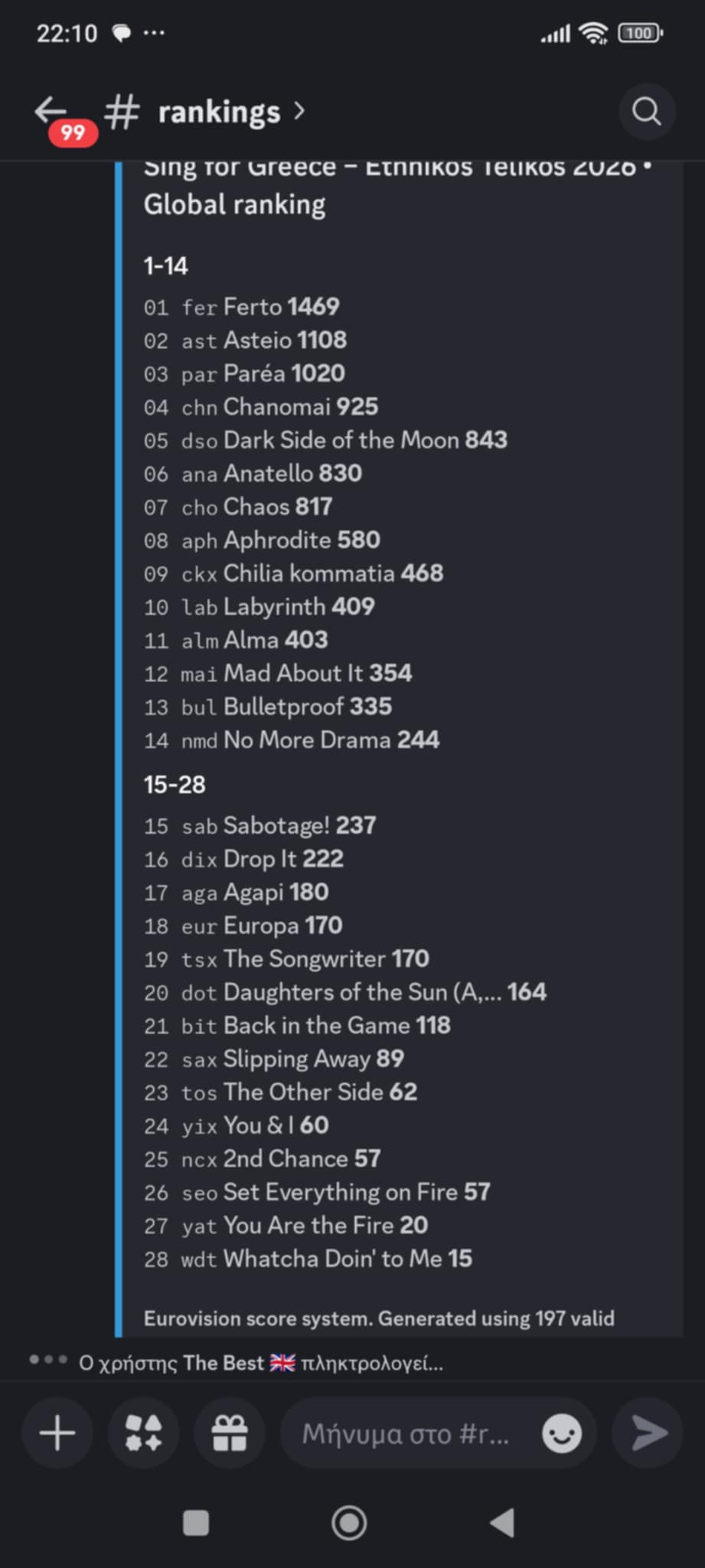 Even though in Greece the selection is often seen as a two-horse race between Akylas and Good Job Nicky, the picture is quite different internationally. “Ferto” is clearly leading both Eurovision’s official Discord group poll and Reddit poll, while “Dark Site of the Moon” ranks only 5th in both. It trails “Chanomai” by Marseaux, “Parea” by Evangelia—who is beloved within the Eurovision community—and “Asteio” by Zaf, which seems to be generating more hype internationally than in Greece.